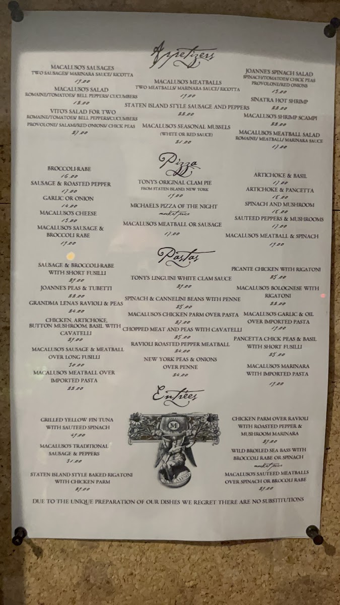 Macaluso's Restaurant offers a thoughtfully crafted menu rooted in classic Italian tradition with a touch of Staten Island influence. The dishes strike a balance between comforting and refined, ideal for both casual dinners and special occasions. This is a place where familiar favorites like Chicken Parmesan and Shrimp Scampi coexist with distinctive plates such as Staten Island Style Baked Rigatoni and Pancetta Chickpea Basil Fusilli, inviting guests to enjoy hearty, well-prepared meals in a warm, inviting atmosphere.